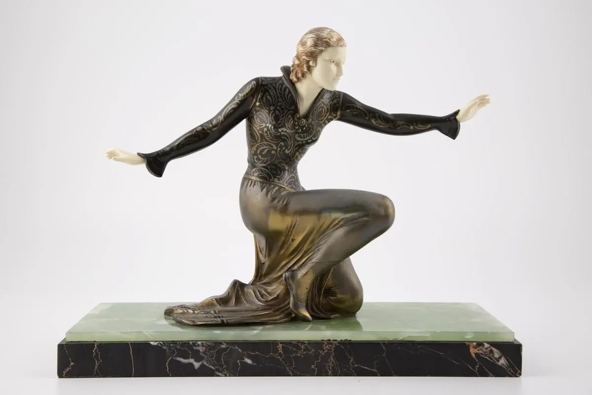 "For meg er denne kvinnen, utført i kryselefantin (elfenben og metall), et uttrykk for at det må være lov til å leve og ha det gøy, også i tunge tider." - Jørgen Moe, keramiker og førsteamanuensis i kunst og håndverk. Ugo Cipriani (usikker), Bordskulptur (1930-tallet), Frankrike. Foto: Uta Freia Beer | Nordenfjeldske Kunstindustrimuseum (NK1987-317)