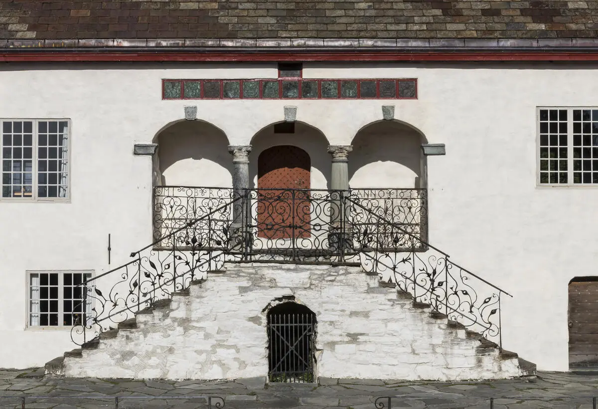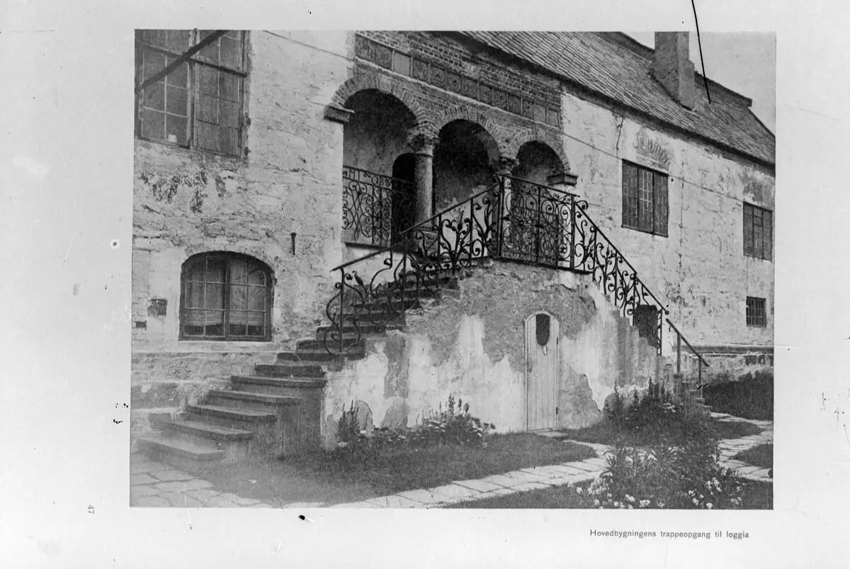 Selve trappa opp til hovedbygningen er ombygd i hvert fall èn gang, men det skråstilte gelendret antar vi er intakt fra 1600-tallet. Det samme kan sies om gelendret på toppen av trappa samt de to delene i bakre del inne i loggiaen.