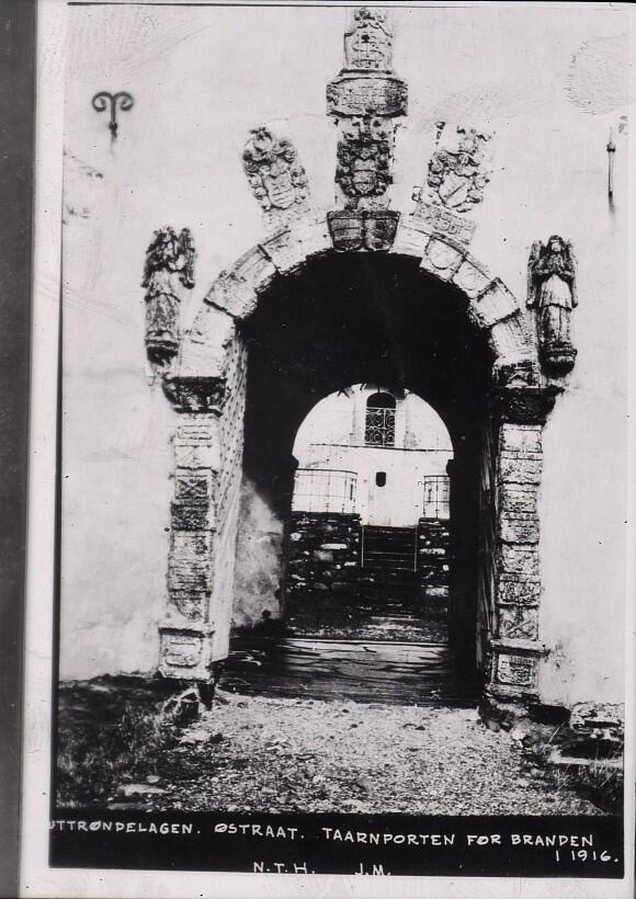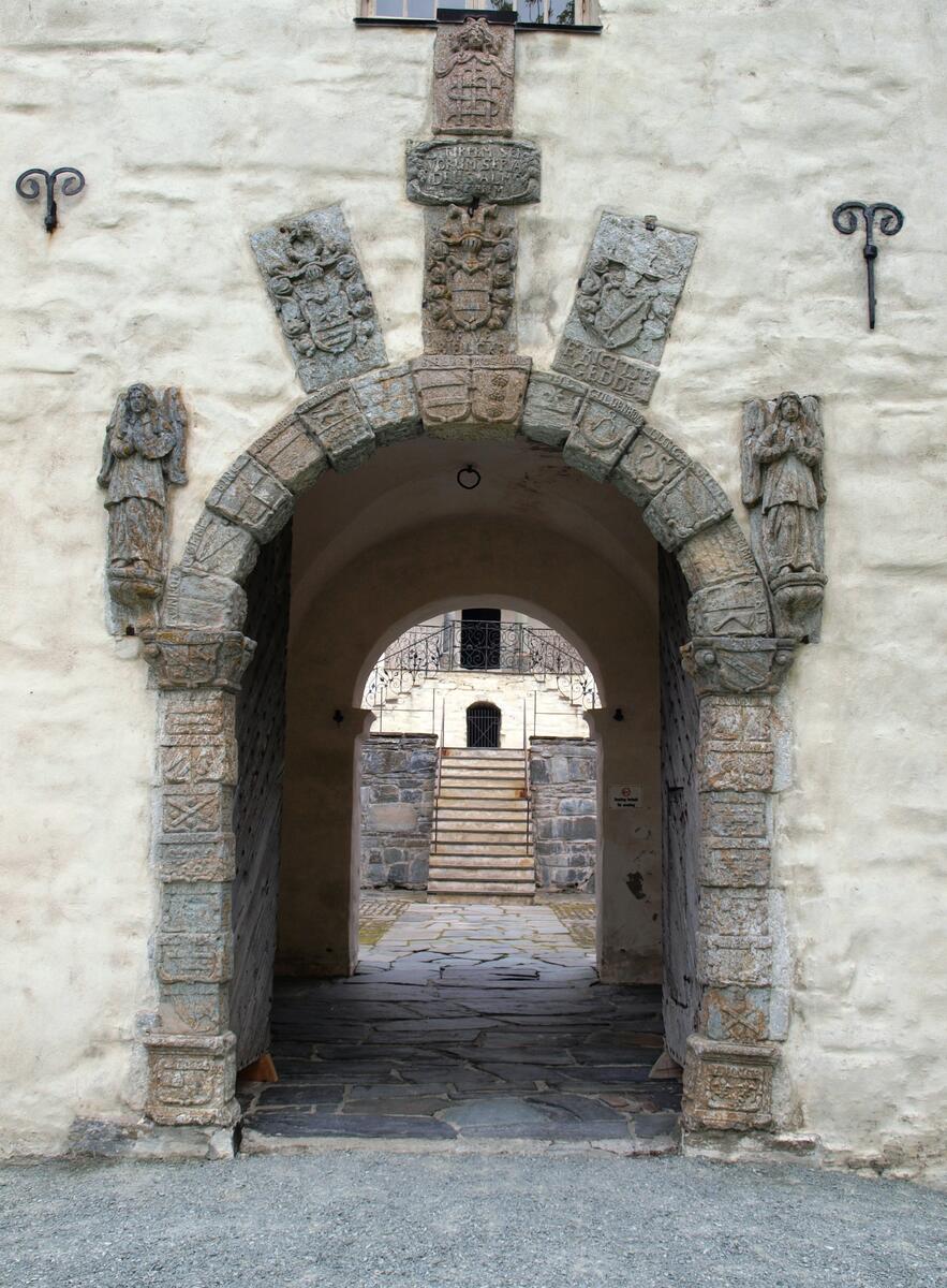 Inngangsportal med Maren Juels, Ove Bjelkes og Regitze Gjeddes våpenskjold. Foto: ukjent/NKIM