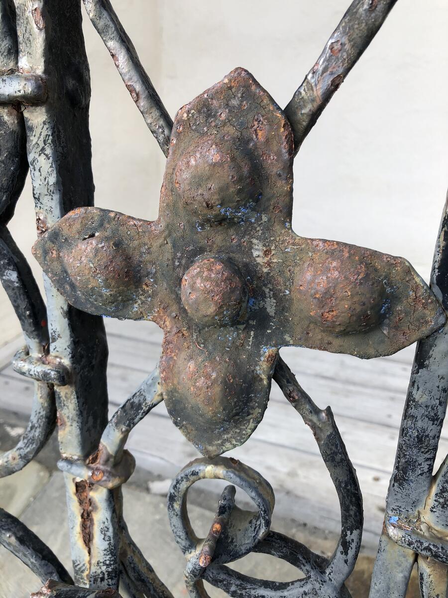 Det skråstilte gelenderet samt gelenderet på toppen av selve trappa er bare omtrentlig datert, men for de sistnevnte to deler vet vi alderen da de så beleilig er daterte. På gitterets øvre del kan vi lese «ANNO 1655».