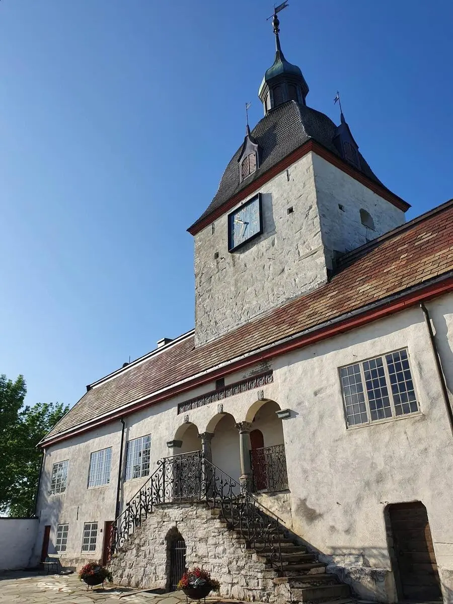 Fasade med trapp og rødmalt dør inn til hovedbygningen. Foto: Katie Kulseng/NKIM
