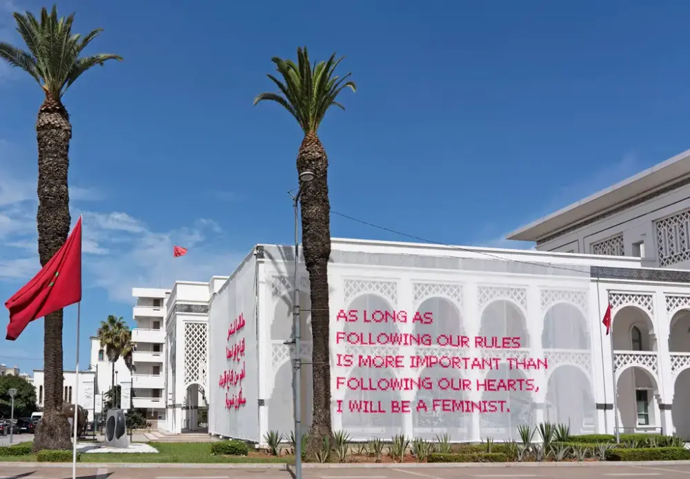 Eksempel på et tidligere SOLANGE-verk: AS LONG AS FOLLOWING OUR RULES IS MORE IMPORTANT THAN FOLLOWING OUR HEARTS, I WILL BE A FEMINIST. Musée Mohammed VI d’art moderne et contemporain, Rabat, Marokko, Rabat Biennale, September 2019 - Januar 2020