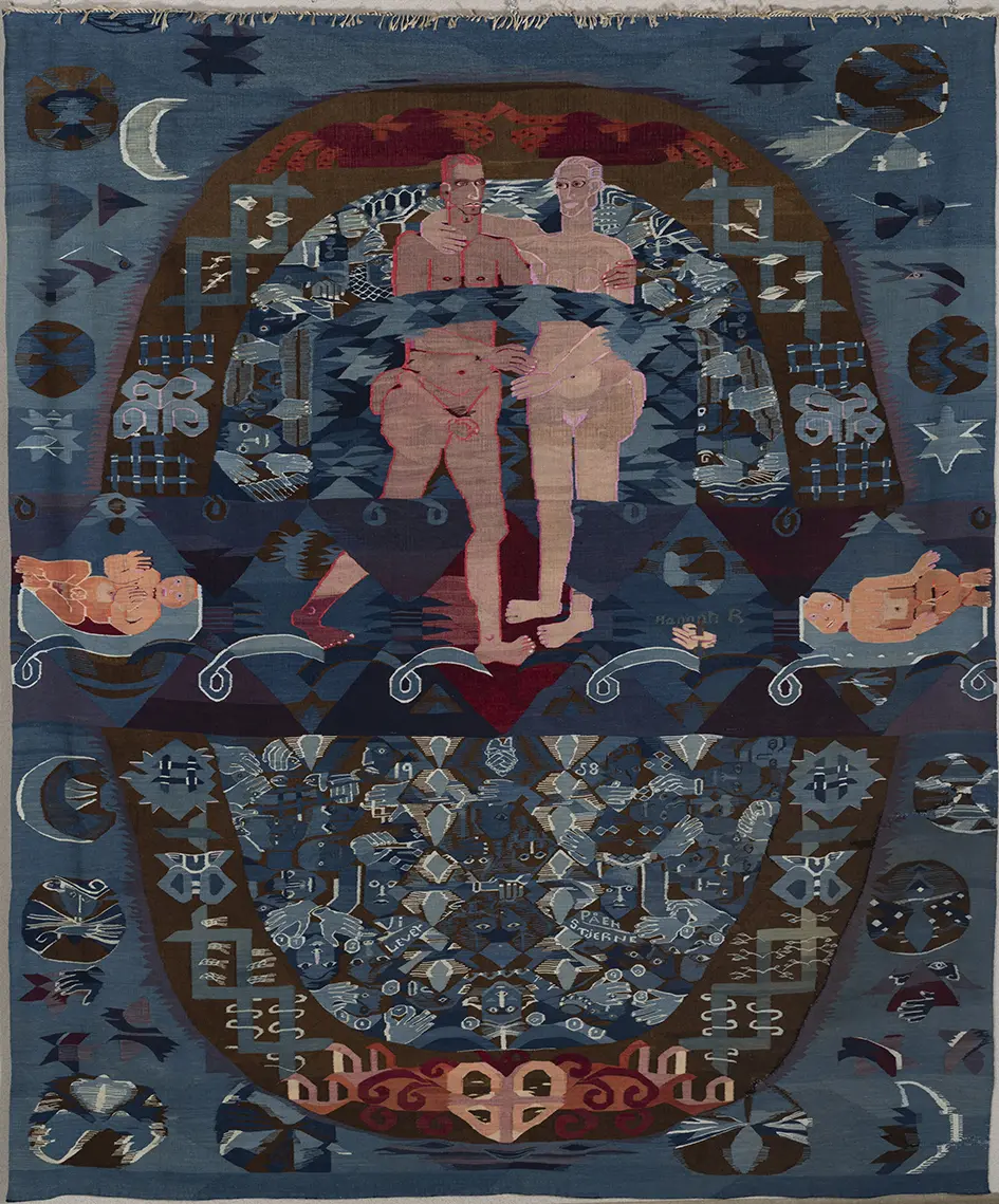 Hannah Ryggen, "Vi lever på en stjerne", 1958. Billedvev i ull og lin, 400 x 300 cm. Eies av den norske stat. Foto: Thor Nielsen. © Hannah Ryggen / BONO 2022