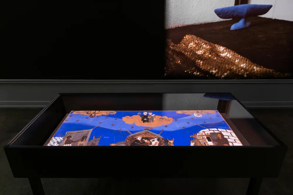 Hannah Ryggen, "Himmelrop" (1941) Olje på treplate (i monter). Tilhører Trondheim kunstmuseum. Hege Lønne, "Untitled" (1985) Foto på tapet. Courtesy of Cecilie Lønne. Foto: Susann Jamtøy - 2/3