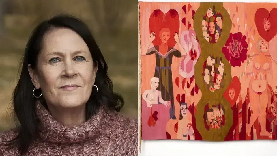 Portrettfoto: Sarah Angelica Spilling. Hannah Ryggen, 'Mors hjerte', 1947. Billedvev i ull, silke og lin, 190 x 186 cm. Nordenfjeldske Kunstindustrimuseum. Foto: Freia Beer/NKIM