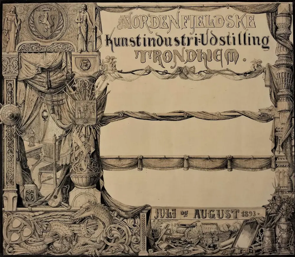 Ant. arkitekt Carl Julius Bergstrøm, "Plakat for Den Nordenfjeldske Kunstindustriudstilling" (1893). Utstillingen, som ble avholdt sommeren 1893, resulterte i at Nordenfjeldske Kunstindustrimuseum ble stiftet den 2. oktober samme år.