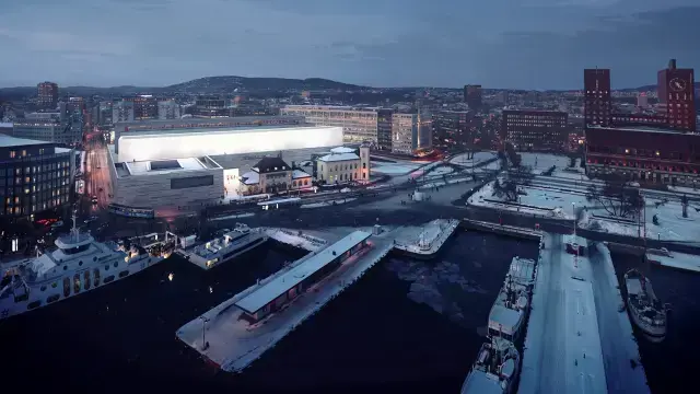 Illustrasjon av det nye Nasjonalmuseet for kunst, arkitektur og design på Vestbanen Illustrasjon: MIR kommunikasjon / Kleihues + Schuwerk / Statsbygg | Nasjonalmuseet for kunst, arkitektur og design