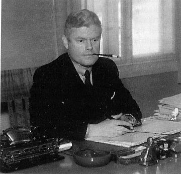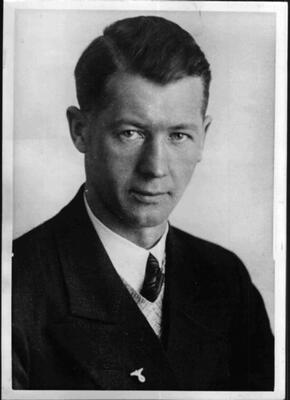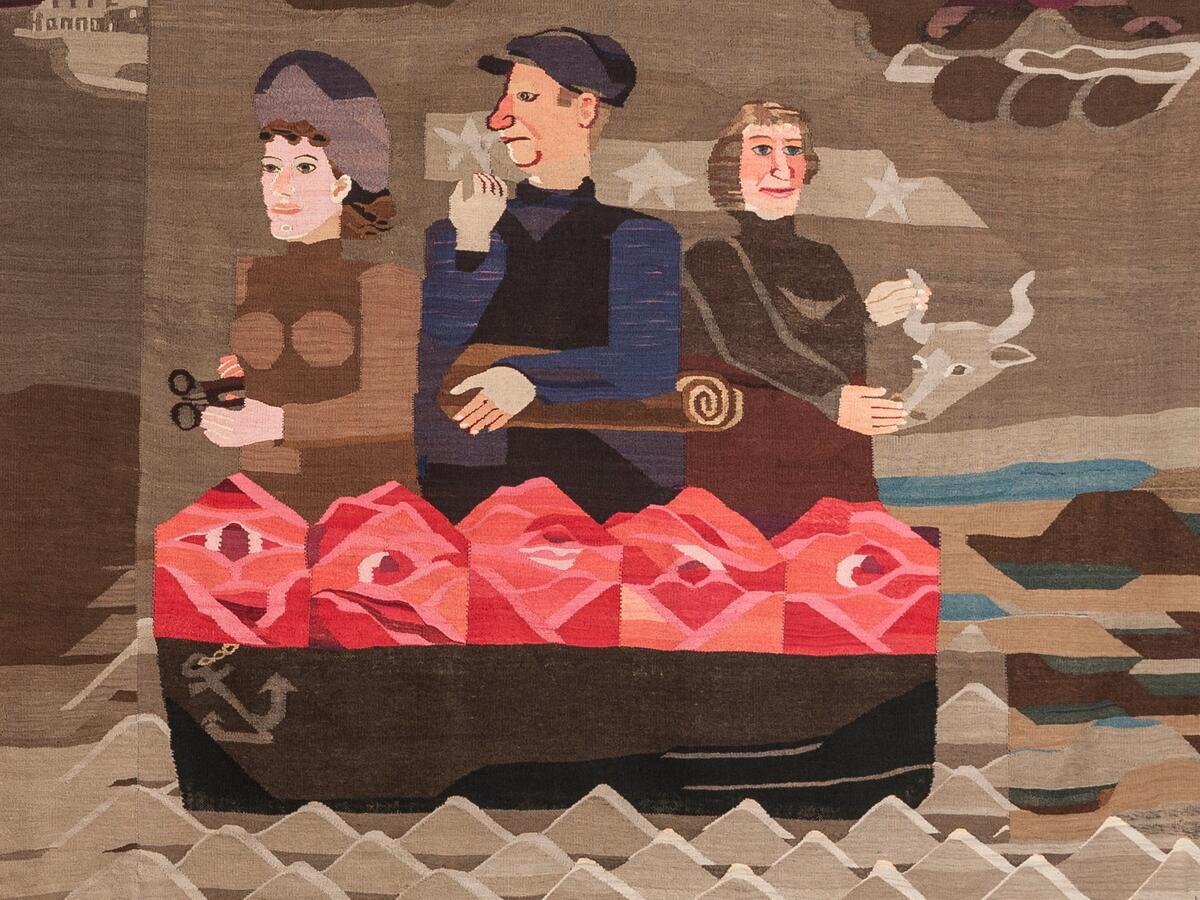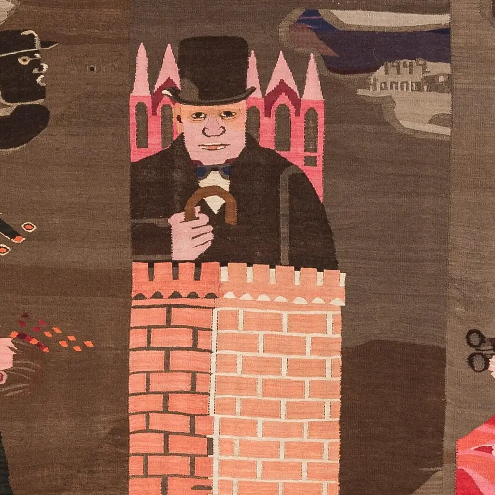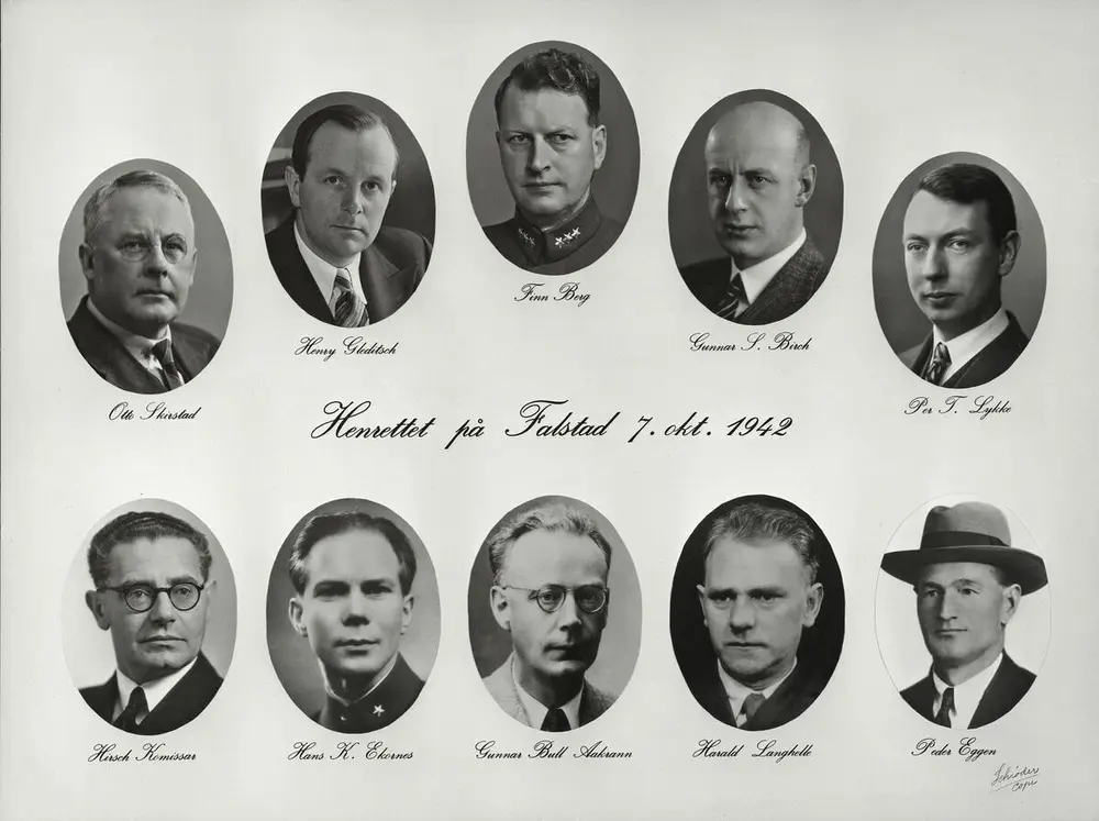 Fuglene har her fått menneskehoder. Hvem er de? Til venstre ser vi Knut Hamsun, kjent nazisympatisør, med teksten "dem om det" skrevet over fuglekroppen. Vidkun Quisling, ministerpresident og leder for den nyopprettede «nasjonale regjering» leder toget an mot tårnet i midten av billedflaten.