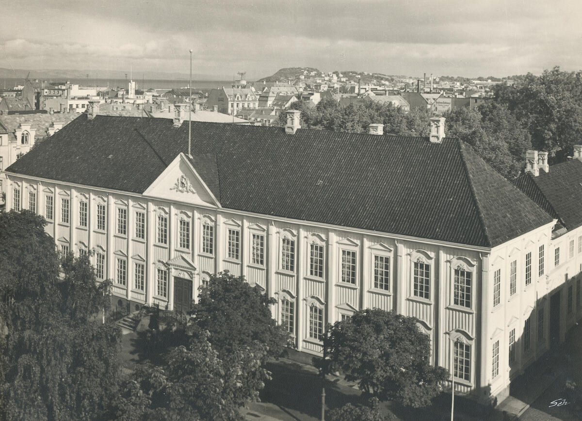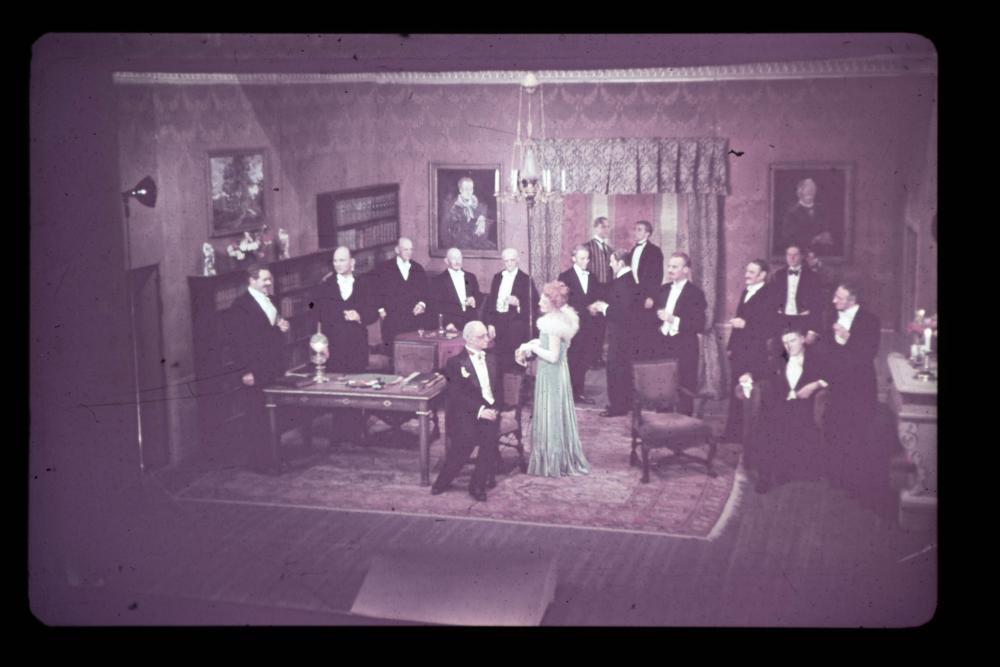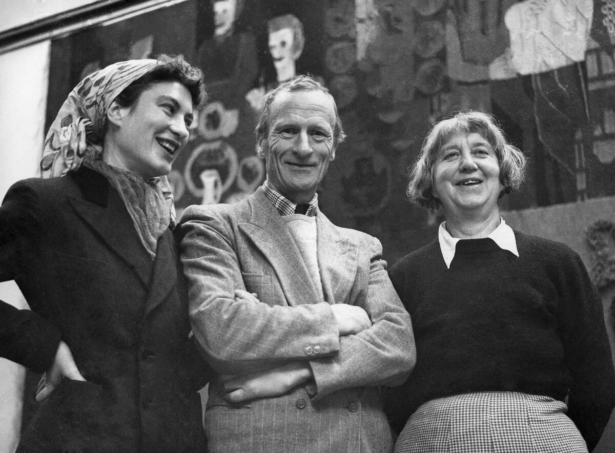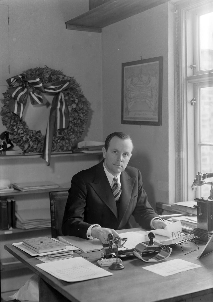 Fuglene har her fått menneskehoder. Hvem er de? Til venstre ser vi Knut Hamsun, kjent nazisympatisør, med teksten "dem om det" skrevet over fuglekroppen. Vidkun Quisling, ministerpresident og leder for den nyopprettede «nasjonale regjering» leder toget an mot tårnet i midten av billedflaten.