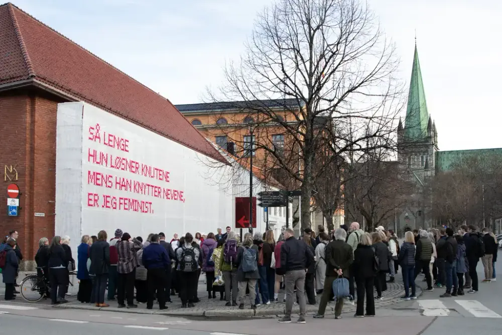 Hvilken setning ville du ha skrevet, om den skulle bli brodert på et 7 x 23 meter stort stillasnett på en fasade midt i Munkegata?
