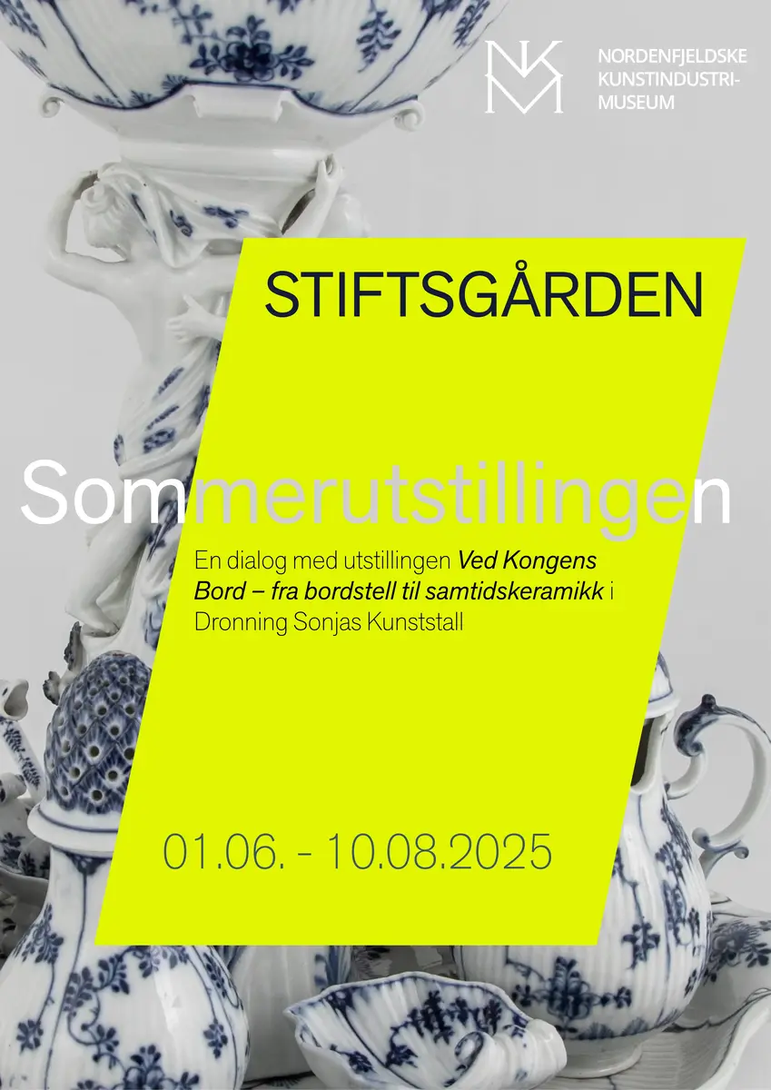 I forbindelse med utstillingen Ved Kongens Bord – fra bordstell til samtidskeramikk i Dronning Sonjas Kunststall, har Nordenfjeldske Kunstindustrimuseum gjort en ny borddekking i spisesalen. Vanligvis er bordet dekket med Stiftsgårdens eget servise, men for sommersesongen har vi lånt inn syv tallerkener fra de kongelige samlingene. Disse tilhører de ulike kongeboligene og kongeskipet, og spenner seg over 200 år. I tillegg ønsker vi en dialog med samtidsutstillingen i Dronning Sonjas Kunststall. Vi viser derfor keramikk av betydningsfulle kunstnere som Marit Tingleff, Torbjørn Kvasbø, Irene Nordli, Paul Scott og Heidi Bjørgan.