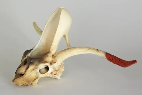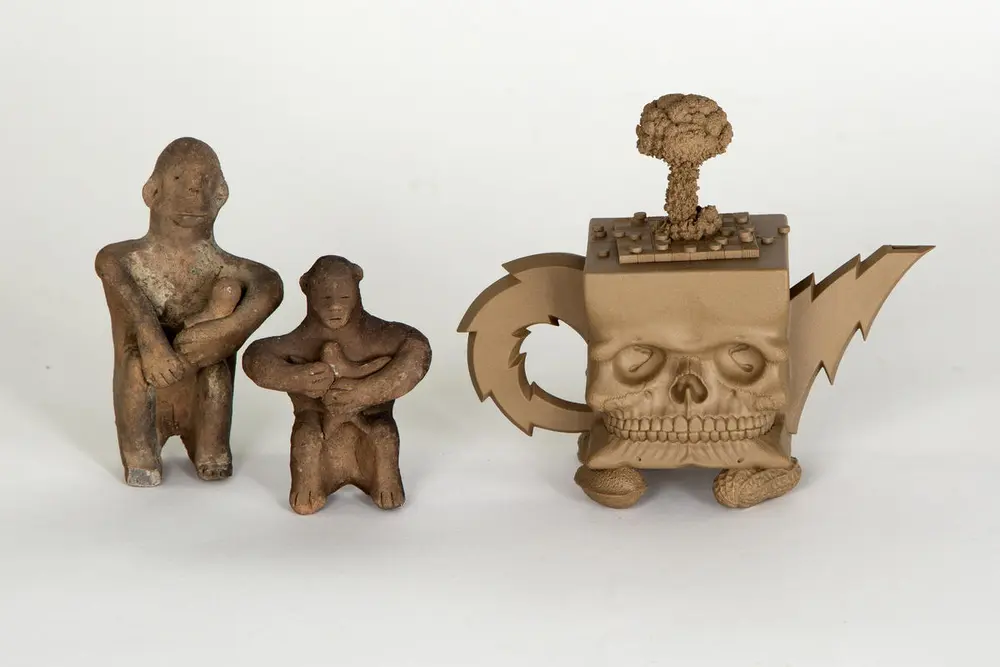 Ammende figurer, Japan, ca. 2000 år gamle + Richard Notkin «Cube Skull Teapot» 1985. Foto Freia Beer/Nordenfjeldske Kunstindustrimuseum