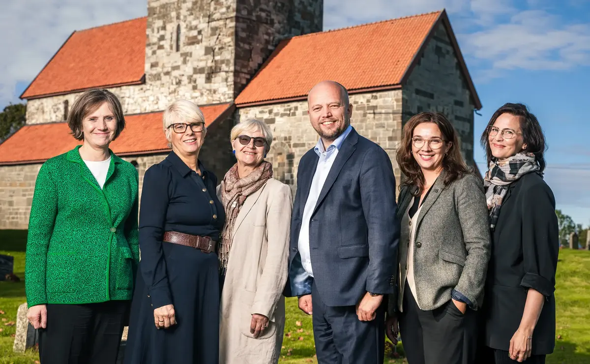 Lanseringen av Tusenårsteppet på Granavollen 17. september 2024. Fra venstre: barne- og familieminister Kjersti Toppe, generalsekretær i Norske kirkeakademier Kristin Gunleiksrud Raaum, tidligere ordfører i Gran kommune Randi Eek Thorsen, finansminister Trygve Slagsvold Vedum, museumsdirektør ved Nordenfjeldske Kunstindustrimuseum Ingrid Lunnan og direktør ved Museene Arven Heidi Anett Øvergård Beistad. Anders Bakken