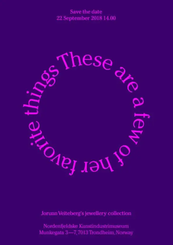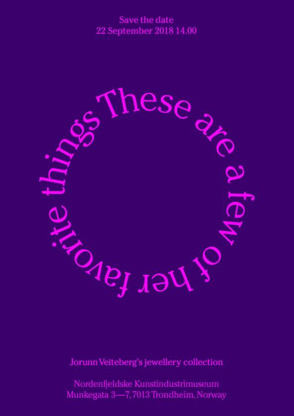 Nordenfjeldske Kunstindustrimuseum har gleden av å invitere til åpning av "These are a few of her favourite things". Utstillingen viser smykkesamlingen til kunsthistoriker Jorunn Veiteberg, og er kuratert av Gjertrud Steinsvåg. Åpningstalen vil holdes av forfatter Einar Økland, og det vil fremføres et musikalsk innslag av saksofonist John Pål Inderberg og pianist Erling Aksdal.