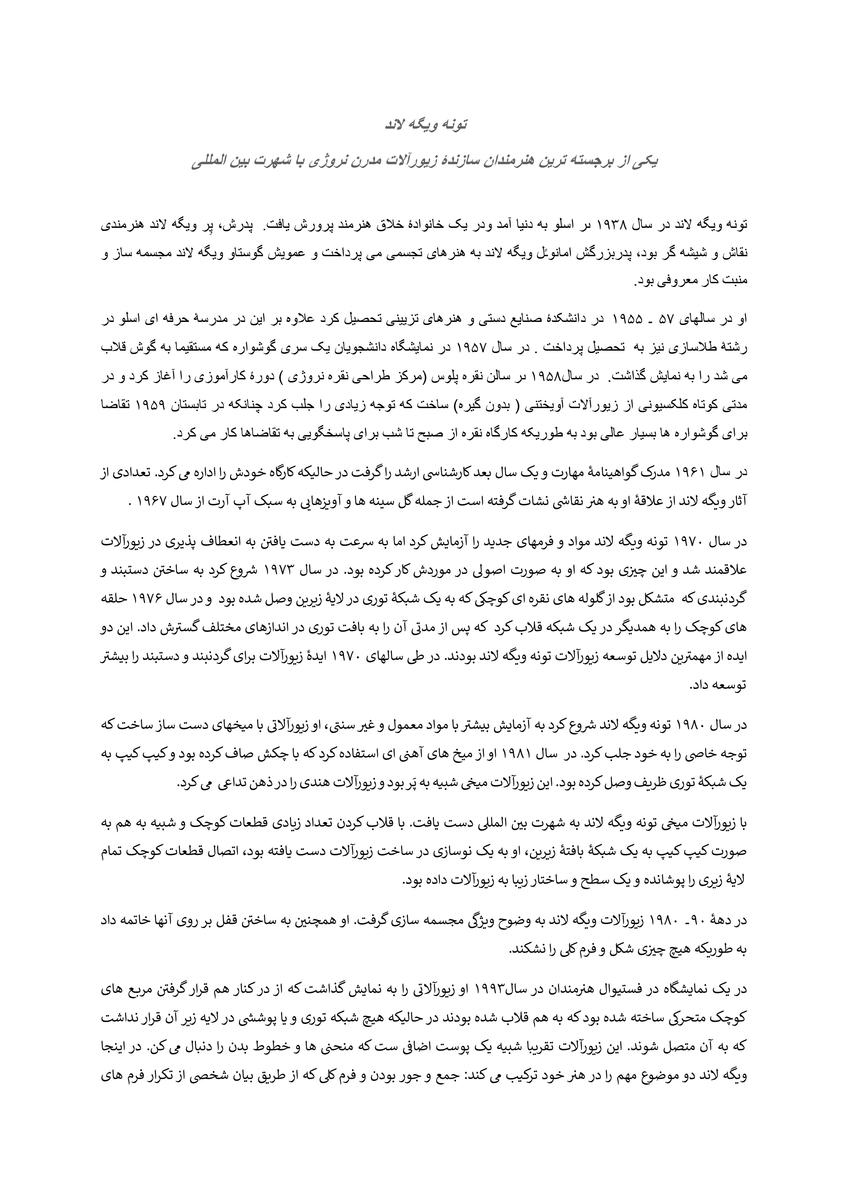 تونه ویگه لاند یکی از برجسته ترین هنرمندان سازندۀ زیورآلات مدرن نروژی با شهرت بین المللی 1/2 2/2 Åpne eller lukk bildetekst 1/1 Tone Vigeland, Halssmykke (1980), tilhører Nordenfjeldske Kunstindustrimuseum Foto: Steffen W. Holden | Nordenfjeldske Kunstindustrimuseum Åpne eller lukk bildetekst Mona Malkhatavi